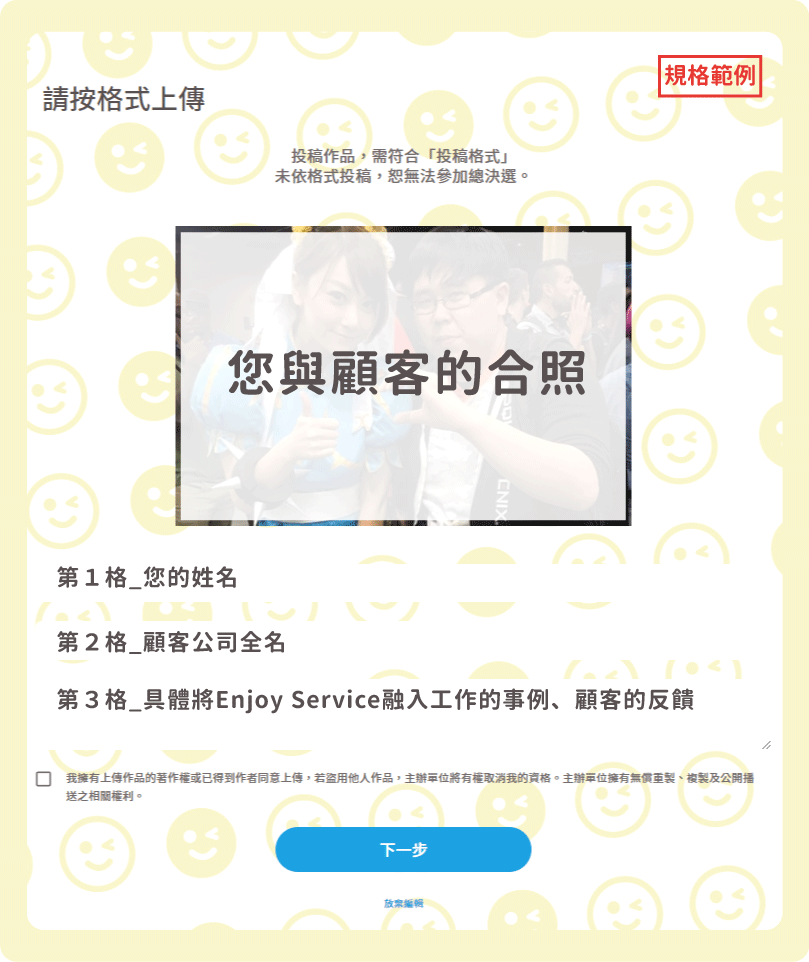 • 投稿格式:1)上傳與顧客的合照 2)具體將Enjoy Service融入工作的事例、顧客的反饋、顧客公司全名,以文字陳述於「圖片描述」中。點擊上傳圖片後,如下圖依序填寫: